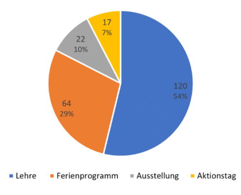 Verteilung der Veranstaltungen mit dem Fischmobil auf die vier Kategorien: Lehre, Ferienprogramm, Ausstellung und Aktionstag