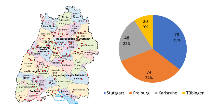 Links: Veranstaltungsorte des Fischmobils 2025; Rechts: Verteilung unserer Veranstaltungen auf die Regierungsbezirke