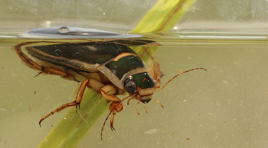 Einfach abtauchen und Pause machen, so wie dieser Gelbrandkäfer. Im Winter ist sein Sauerstoffbedarf stark reduziert und er muss nicht mehr an die Oberfläche. Es genügt der Luftvorrat unter den Flügeldecken, die wie eine physikalische Kieme funktioniert.