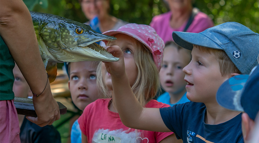 Die Kinder dürfen die scharfen Zähne vom räuberischen Hecht fühlen. Sie sind erstaunt wie dieser heimische Raubfisch lebt und was er frisst. Foto: Dieter Schäuble