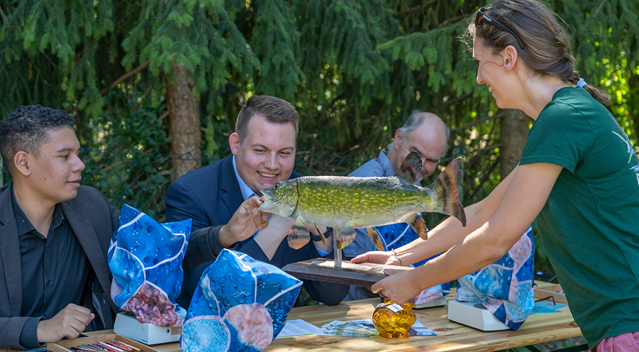 Anna Pechmann (rechts) präsentiert auch Niklas Nüssle (MdL GRÜNE) und seinen beiden Mitarbeitern vom Landtagsbüro die heimischen Raubfische. Foto: Dieter Schäuble