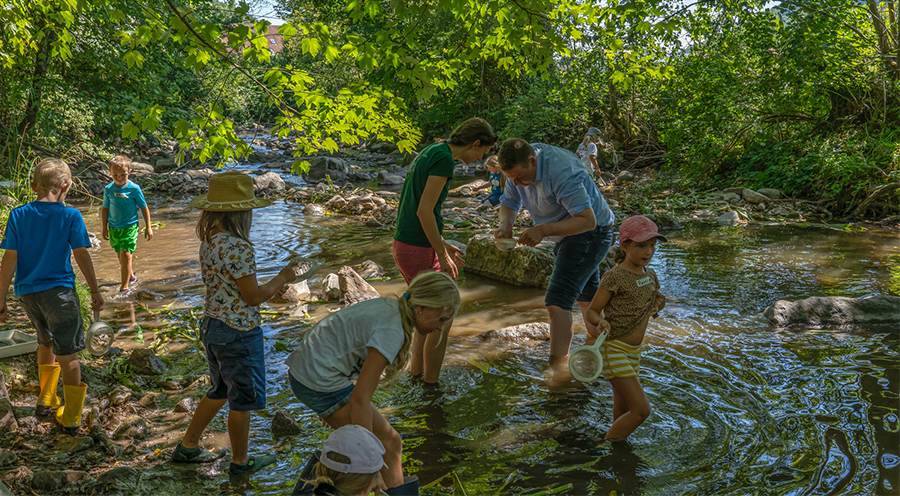 Bei der Expedition im unwegsamen Bachbett der Steina erbeuten die Kinder mit den Keschern zahlreiche Kleintiere, u.a. Insektenlarven, Süßwassermuscheln und Fischbrut. Die Lebewesen werden nach der Bestimmung behutsam wieder zurückgesetzt. Foto: Dieter Schäuble