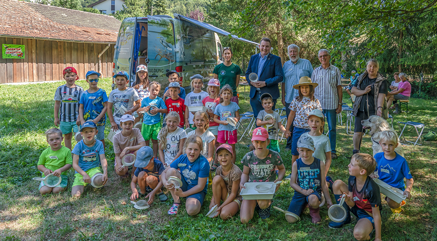 Das Fischmobil im «Klassenzimmer am Bach» in Detzeln bei Waldshut. (hintere Reihe v.l.n.r.): Anna Pechmann, Projektleiterin «Fisch on Tour», Niklas Nüssle, Landtagsabgeordneter (GRÜNE), Jörg Kasseckert, Vorsitzender Erlebbare Umweltbildung e.V., Raymond Vöstel, LFVBW-Kreisvorsitzender und Esther Koch, Ortsvorsteherin WT-Detzeln. Alle Kinder und Niklas Nüssle sind schon mit Keschern «bewaffnet» und bereit für eine Expedition ins unwegsame Bachbett der Steina.  Foto: Dieter Schäuble.