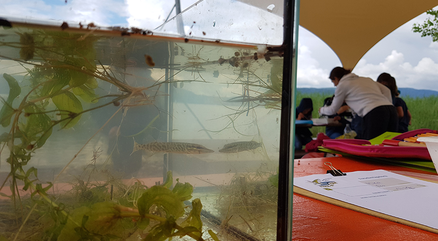 Mitte Juli waren wir zu Gast bei der Landesgartenschau in Überlingen. Gemeinsam mit dem GRÜNEN KLASSENZIMMER gestalteten wir Unterricht für Schulklassen am schönen Bodensee. Während der letzten Veranstaltung ging uns tatsächlich ein kleiner Hecht in den Kescher! Dieser wurde von Groß und Klein ausgiebig bestaunt und beobachtet, bevor wir ihn wieder schwimmen liesen.